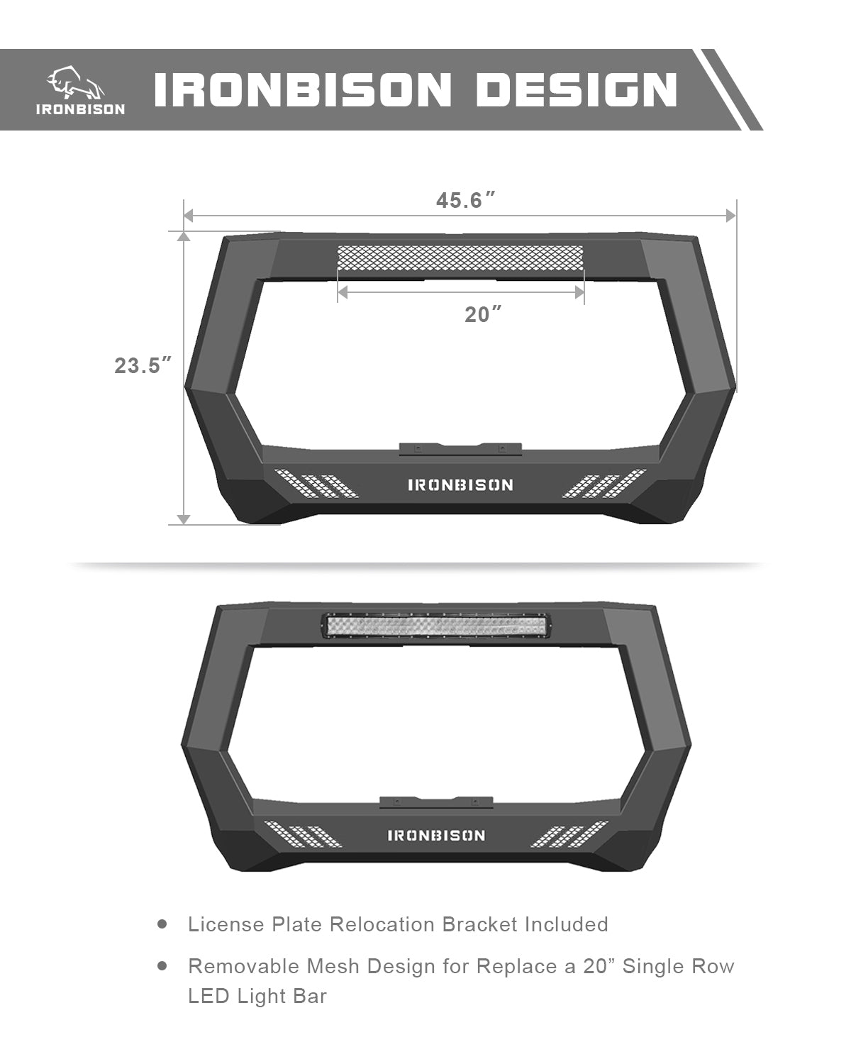 INNOVATIVE DESIGN – IRONBISON one piece bull bar body design compatible with original front parking sensors. Provide double protection for your vehicle. Removable mesh design easy to replace a 20" single row LED light bar for a better off-road experience.