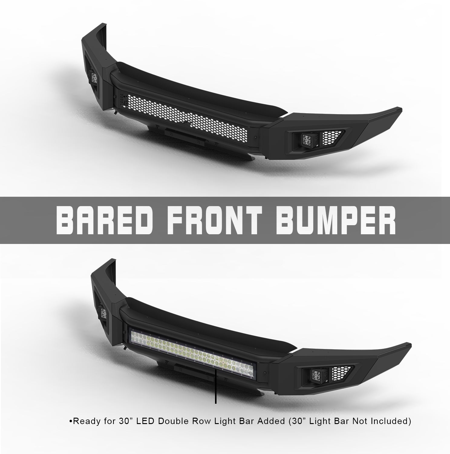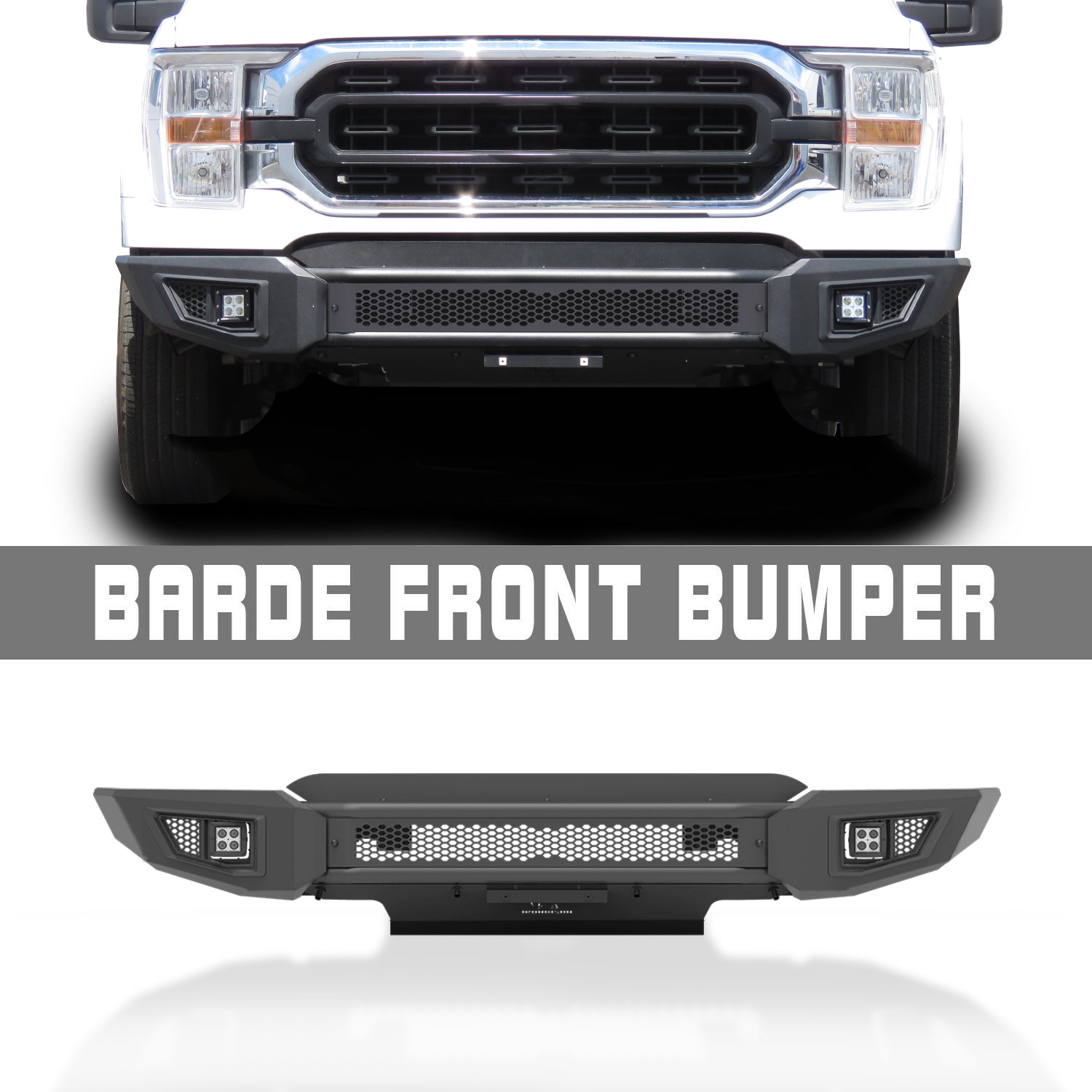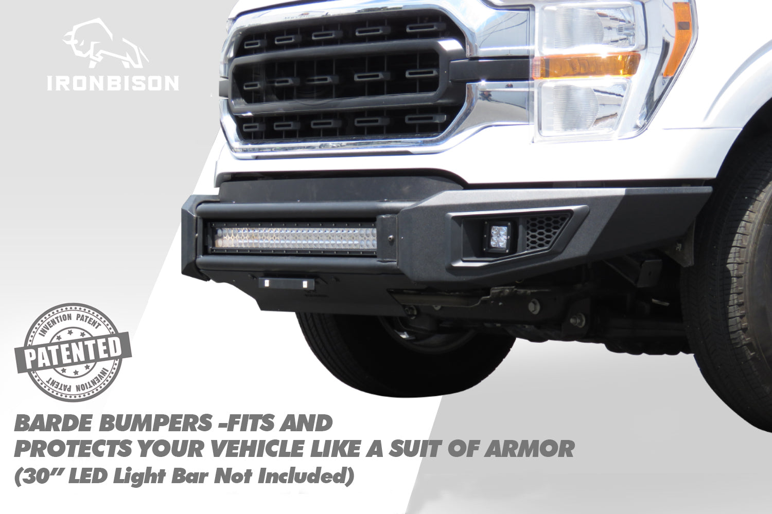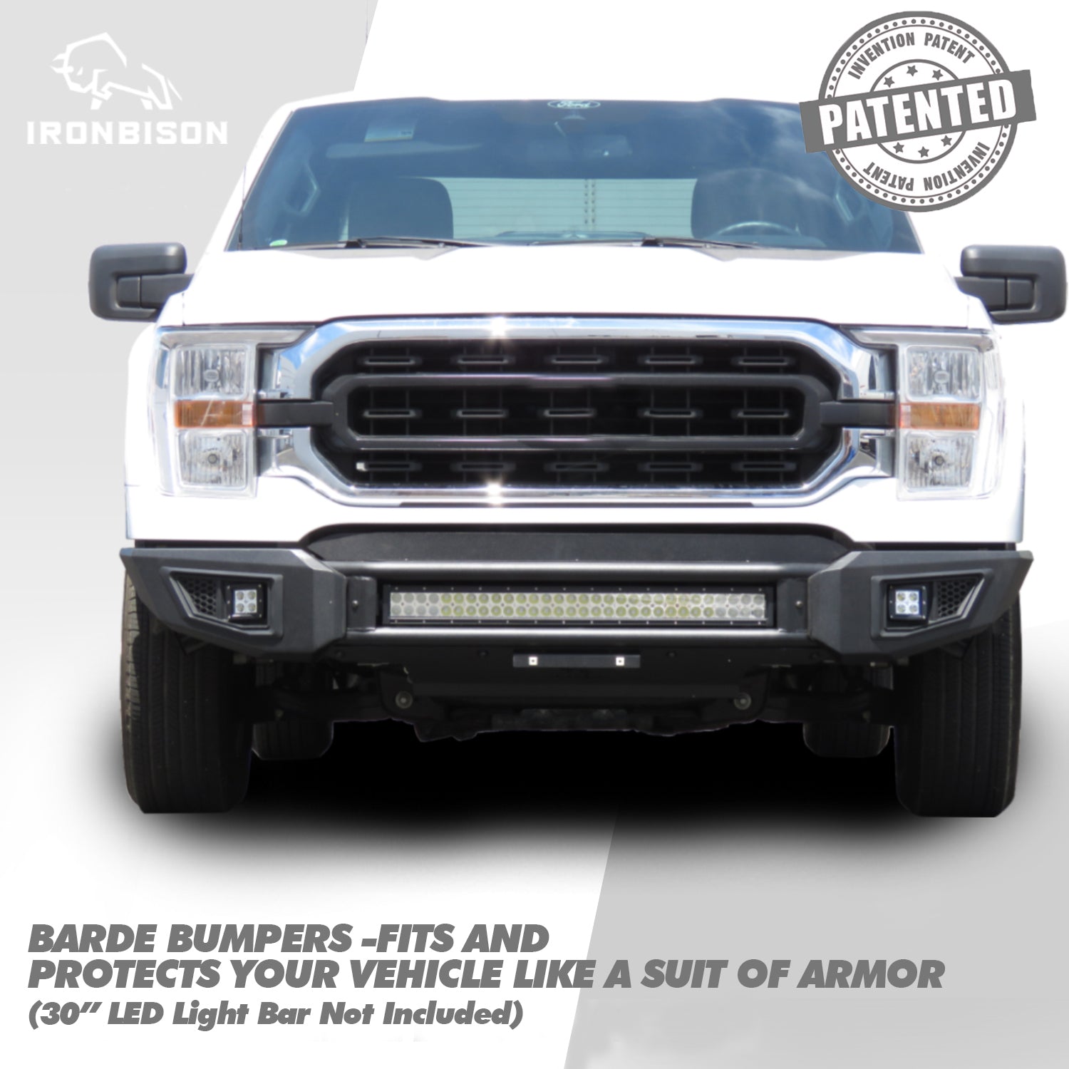 IRONBISON BARDE Front Bumper Compatible with 2021-23 Ford F150 Truck Pickup Fine Textured Black Off Road Replacement Bull Bar Rock Armor with 2 LED Fog Light Splash Guard Can Add 30” LED Light Bar