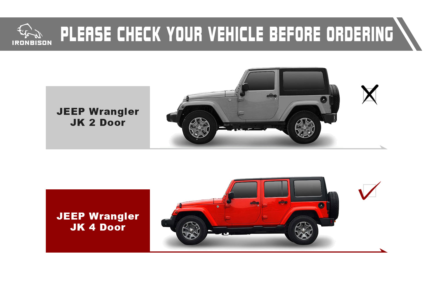 - Important Notice - Only fits 2007-2018 Jeep Wrangler JK 4 Door (Excluded 2018 Wrangler JL) (Sent us the photos of your vehicles to confirm fitment if you not sure about the cab style after check the cab size picture)